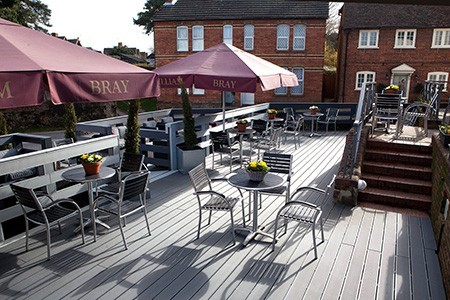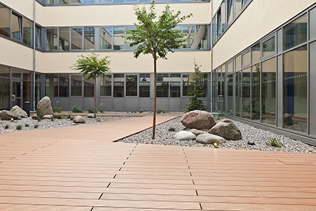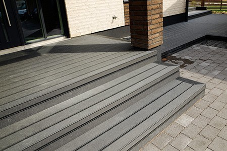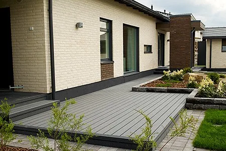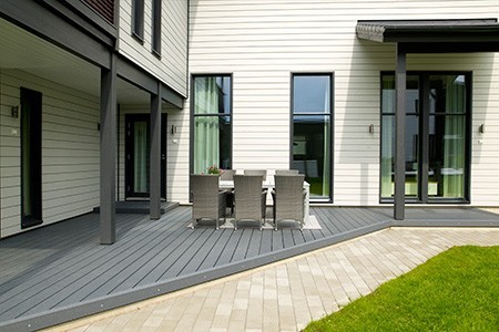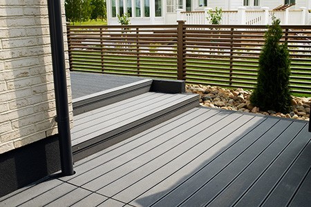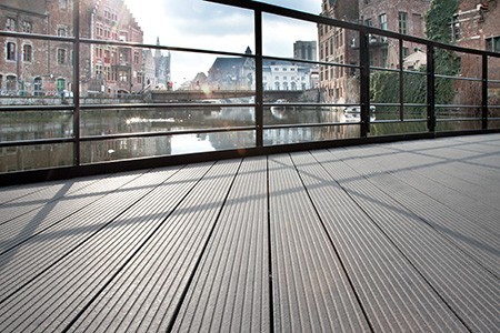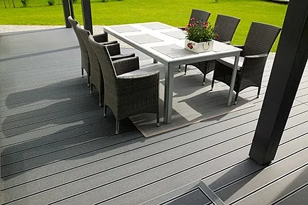 UPM ProFi - ein umweltfreundliches, recycelbares, ausgesprochen strapazierfähiges Holz-Kunststoff-Verbundmaterial mit hoher UV-Beständigkeit, das sich glatt und natürlich anfühlt, kein Vergrauen, kein Splittern - barfuß darauf zu laufen stellt kein Problem dar, sehr pflegeleicht und selbst bei Nässe rutschfest.
